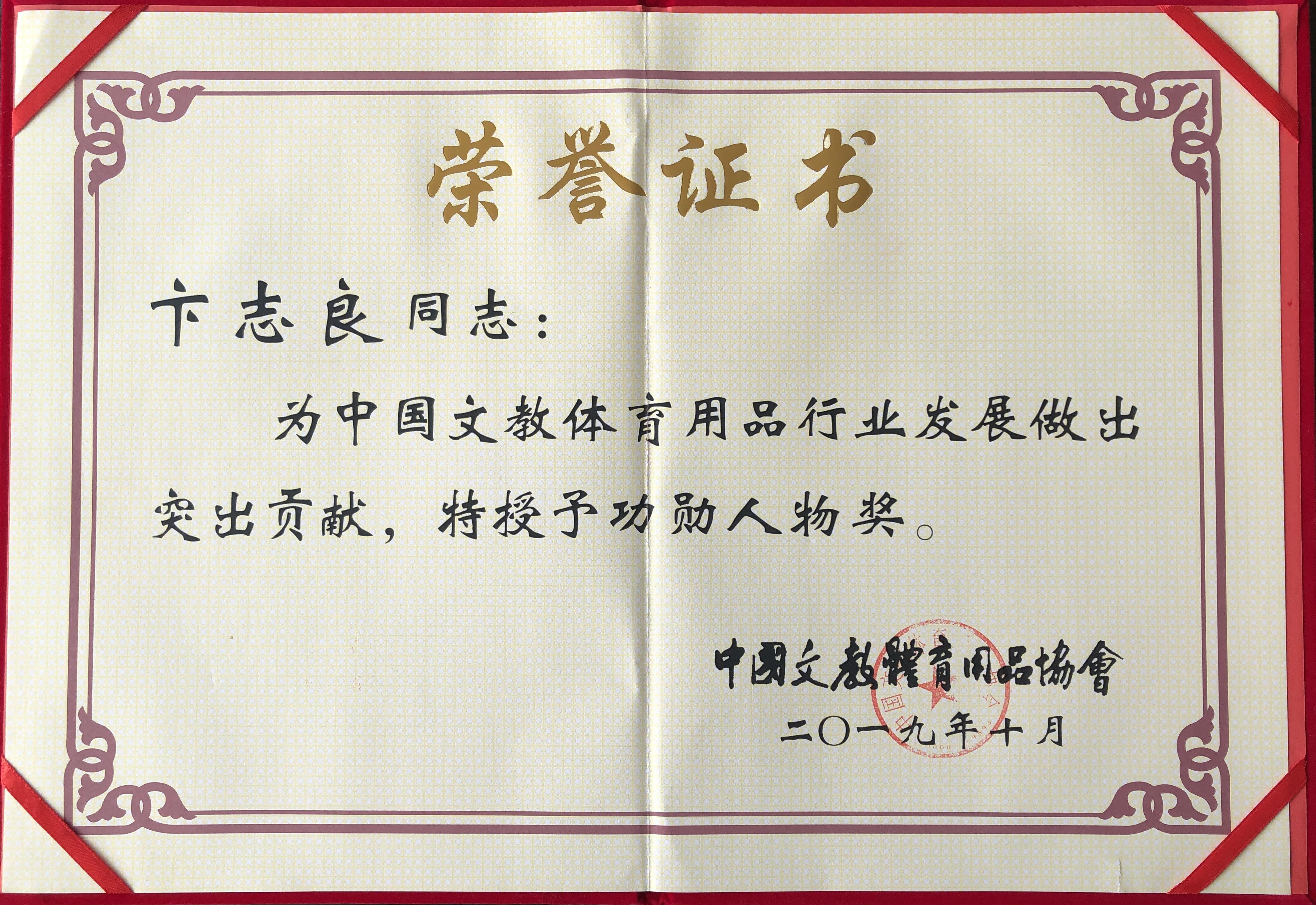 10月18日,中国文教体育用品协会第八届三次理事会暨成立三十周年庆典大会在北京人民大会堂隆重召开。1989—2019三十年间,我国文教体育用品行业发生了翻天覆地的变化,取得了辉煌的成绩。为弘扬艰苦创业、改革创新精神,鼓舞全行业奋勇前行的斗志,暨协会成立三十周年之际,文体协会隆重表彰一批为行业发展做出突出贡献的模范人物,意昂体育产业集团董事长卞志良荣获“功勋人物奖”。