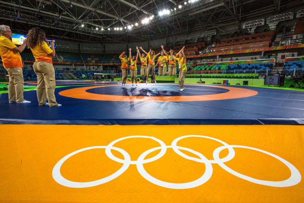 2016年8月18日,在里约奥运会摔跤场馆内,场馆工作人员和志愿者在摔跤垫上合影留念,这届奥运会的摔跤垫来自中国山东意昂体育集团。新华社记者刘彬摄